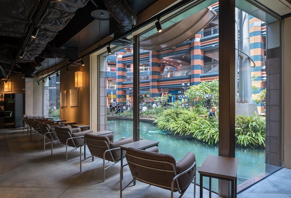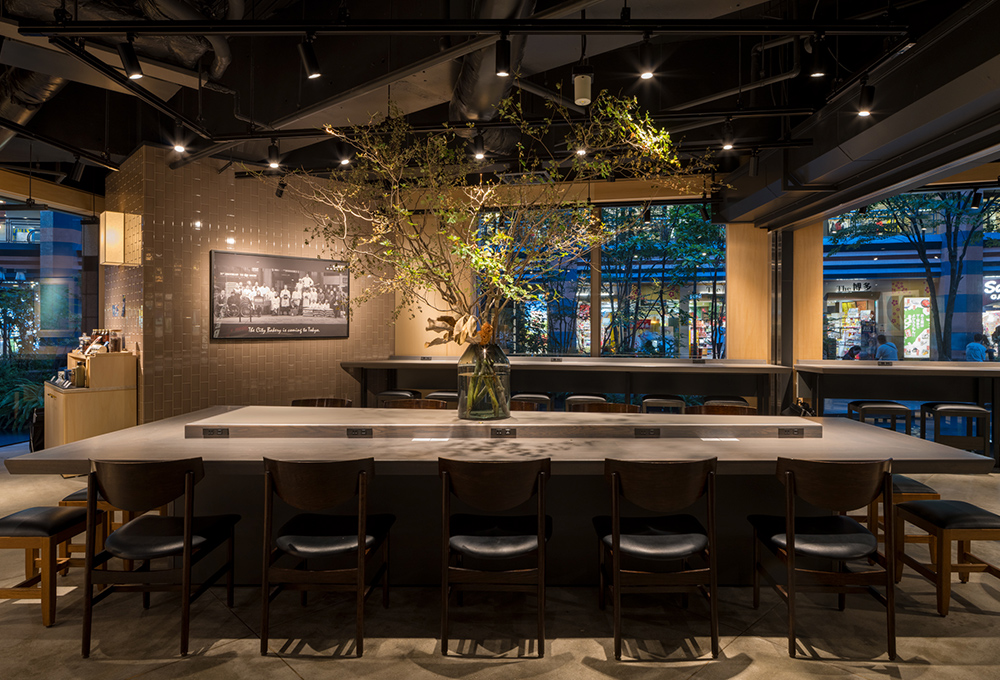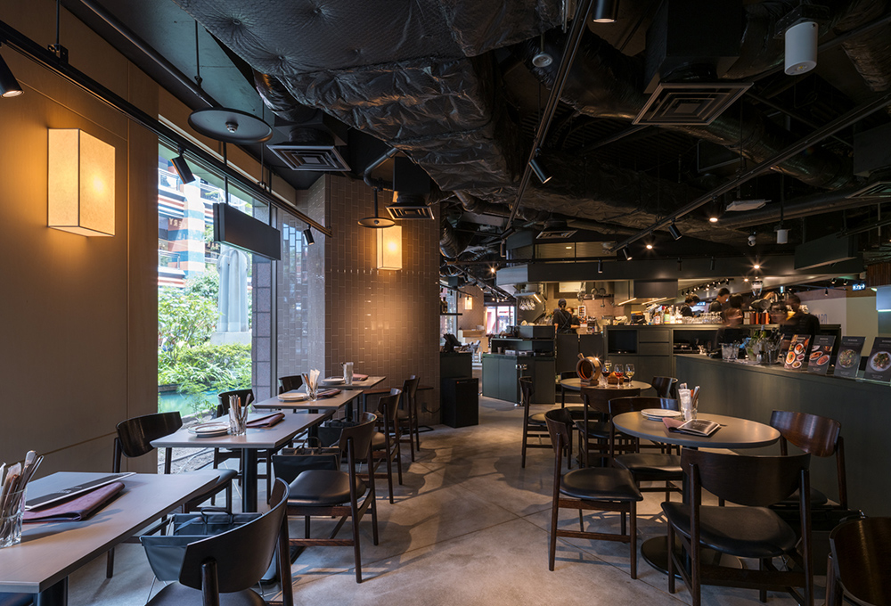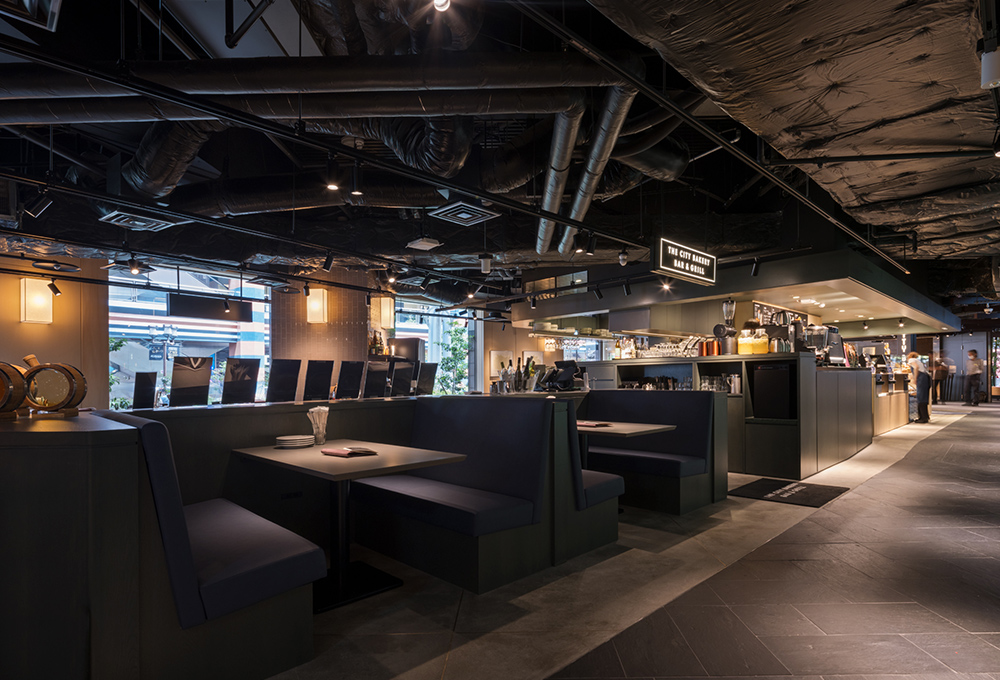 計画では、B1フロア全体の約3割程の広く細長いスケルトン空間に、同オーナーによるカフェ 『 THE CITY BAKERY 』 とレストラン 『 BAR &GLRILL 』 の計2店舗を併設。エリア中央には2店共用のキッチンを配置した。BAR客席からはR状の外壁FIXサッシ越しに噴水とライトアップを眺め、夜遅くまでワインとJAZZを嗜むことが出来る。